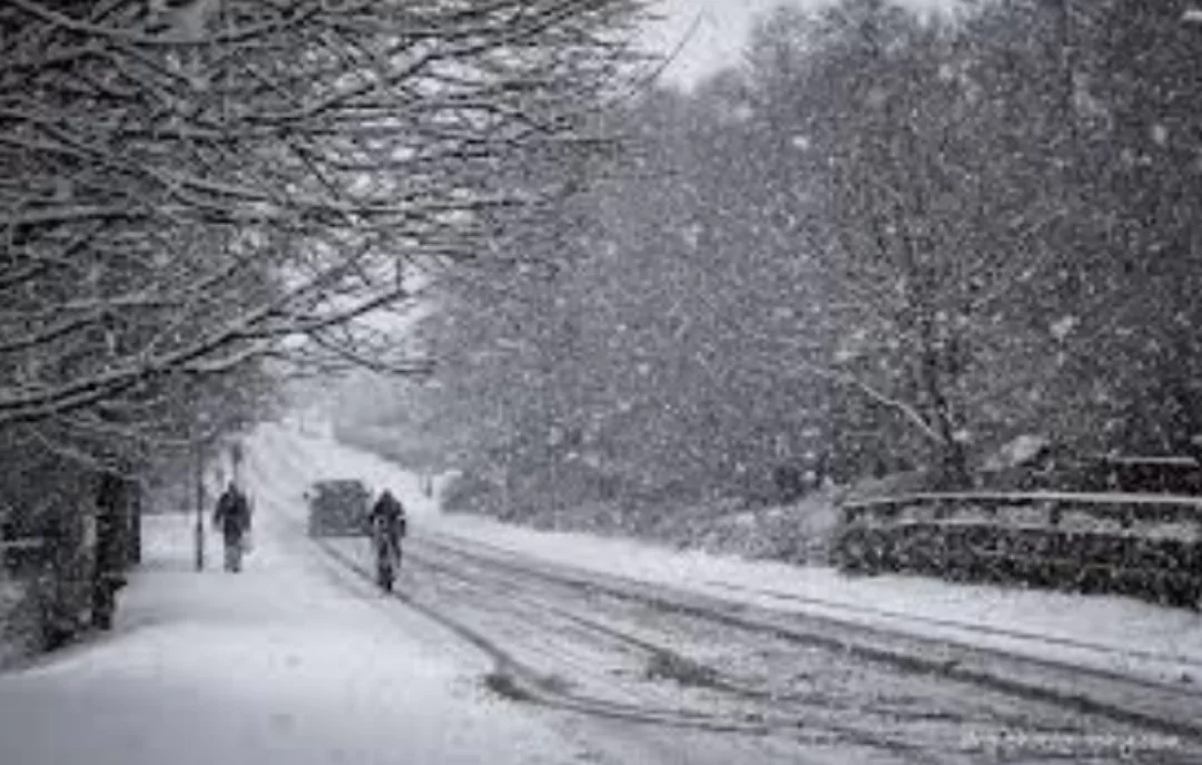 The image depicts a landscape covered in white snow, indicating snowy weather.