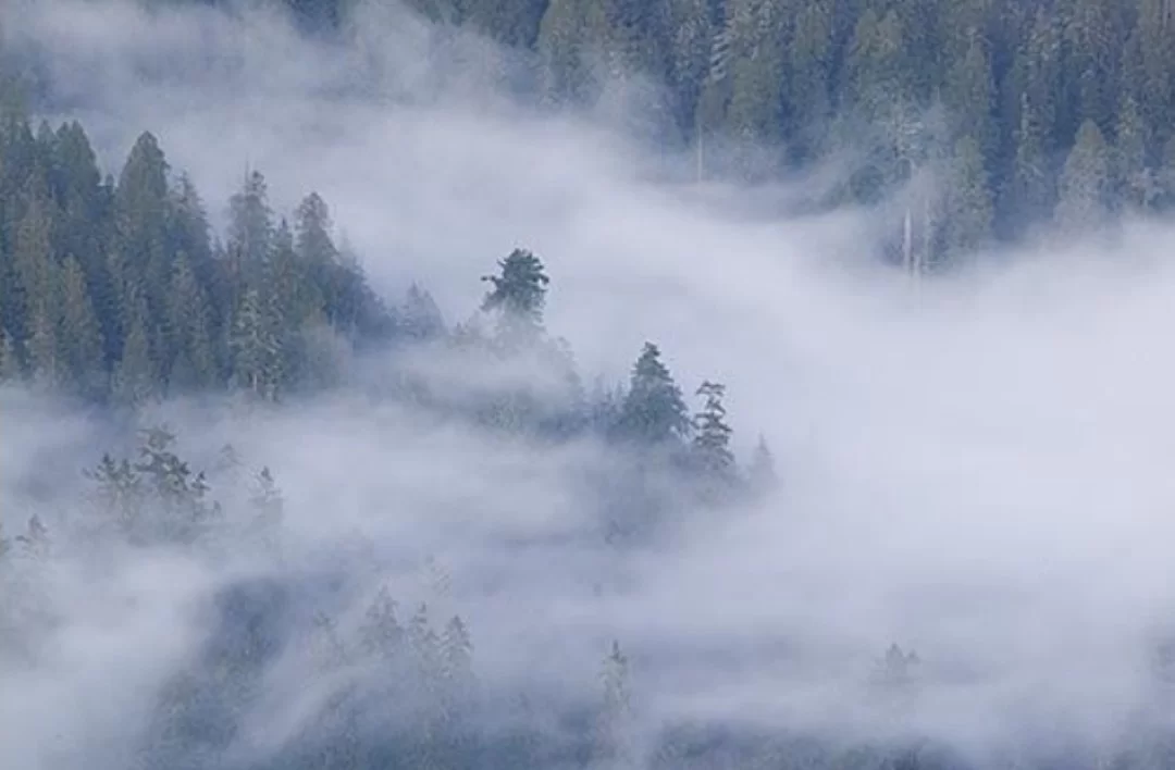 The thick white mist obscuring the trees in the image represents foggy weather conditions.