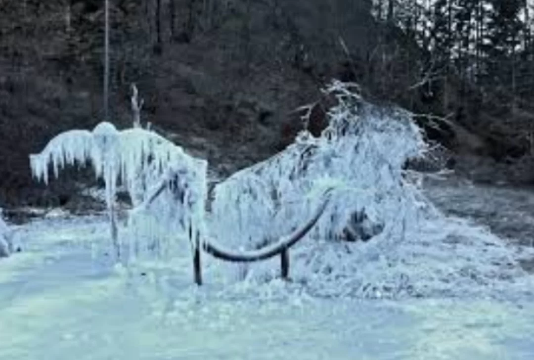 The image shows ice crystals and frost covering outdoor objects, signifying icy weather.