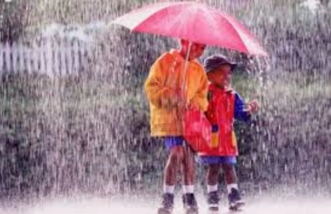 The image shows people using umbrellas and visible precipitation, indicating it is rainy.