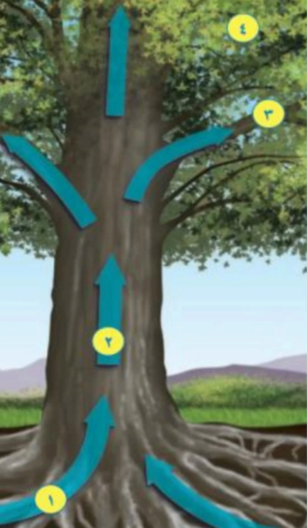 الشكل المجاور يوضح انتقال المواد في النبات، أي رقم يُشير إلى دخول الماء والأملاح من التربة؟