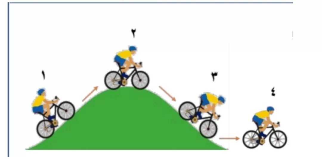 حسب الشكل أدناه، أي الحالات التالية تكون فيها طاقة الوضع أكبر ما يمكن لراكب الدراجة؟