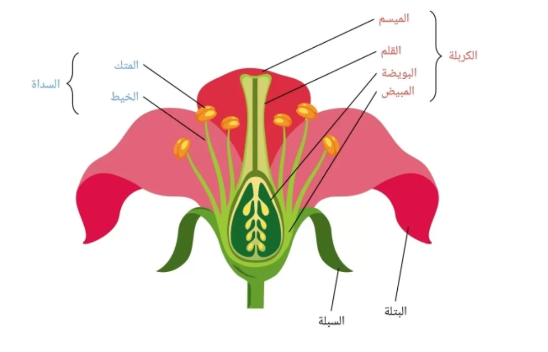 يمثل الشكل التالي بعض أجزاء الزهرة، أي الأجزاء المبينة في الشكل ينتج فيها المشيج المؤنث؟