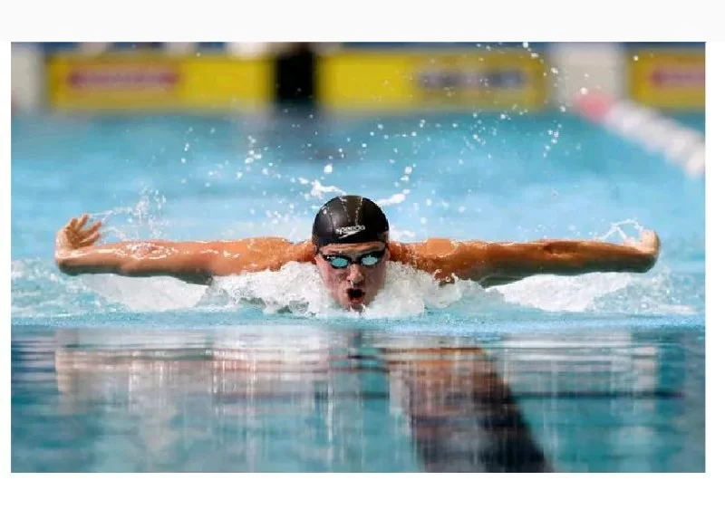 توضح الصورة وضعية سباحة الفراشة، حيث يتحرك كلا الذراعين في وقت واحد بشكل متناغم مع حركة الجسم والتموج القوي.