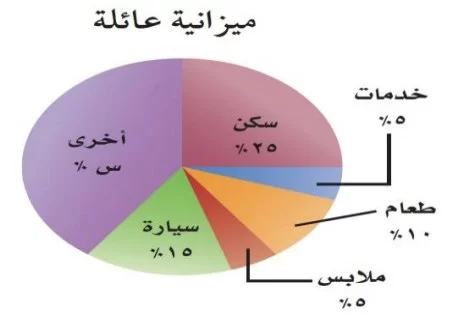 مجموع النسب في القطاع الدائري يجب أن يساوي 100%. مجموع النسب المعلومة هو \(25 + 5 + 10 + 5 + 15 = 60\)، لذا س تساوي \(100 - 60 = 40\).