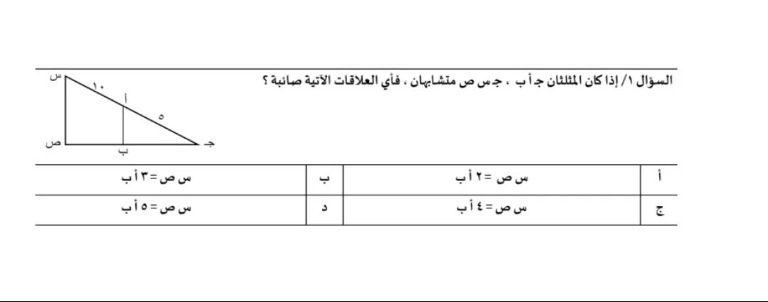 إذا كان المثلثان أ ب ج، د هـ ص متشابهان، فأي العلاقات الآتية صائبة؟