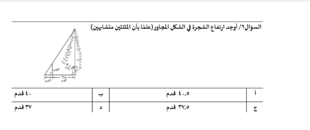 أوجد ارتفاع الشجرة في الشكل المجاور (علماً بأن المثلثين متشابهين):