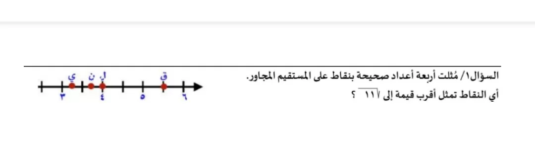 قيمة \(\sqrt{161}\) تقع بين \(\sqrt{144}=12\) و \(\sqrt{169}=13\) وهي أقرب إلى 13 (حوالي 12.68)، وبالنظر للمخطط نجد أن النقطة (ي) هي الأقرب لهذه القيمة.