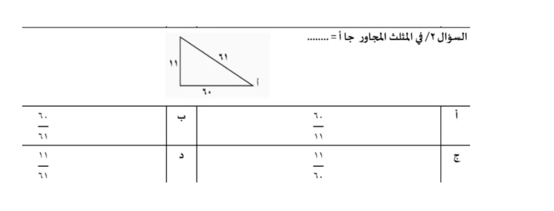 جيب الزاوية (جا) يساوي المقابل على الوتر. في المثلث، المقابل للزاوية أ هو 11 والوتر هو 12، لذا جا أ = 11 / 12.