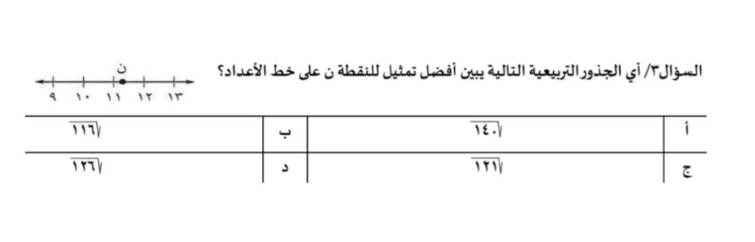 أي الجذور التربيعية التالية يبين أفضل تمثيل للنقطة ن على خط الأعداد؟
