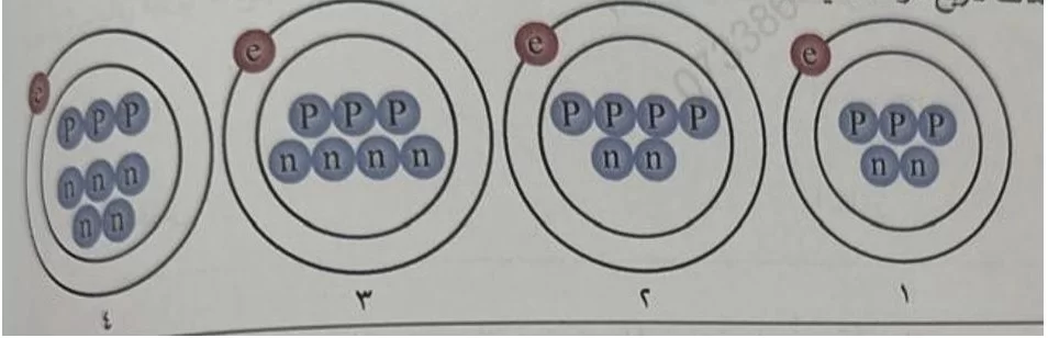 النظائر هي ذرات لنفس العنصر تمتلك نفس عدد البروتونات وتختلف في عدد النيوترونات. بالنظر للصور، الذرات 1 و 3 و 4 تحتوي جميعها على 3 بروتونات، مما يجعلها نظائر لنفس العنصر.