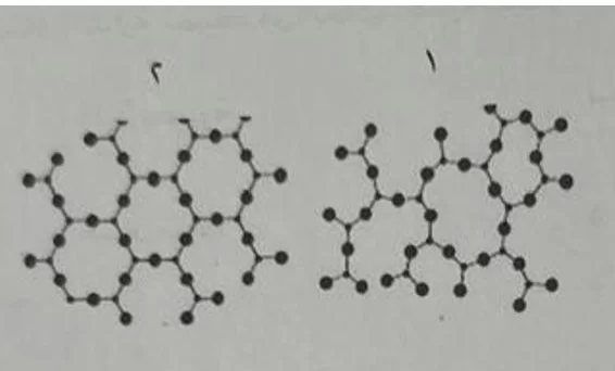 الشكل 1 يظهر ترتيباً ذرياً منتظماً ومتكرراً (بلوري)، بينما الشكل 2 يظهر ترتيباً عشوائياً غير منتظم (غير بلوري).