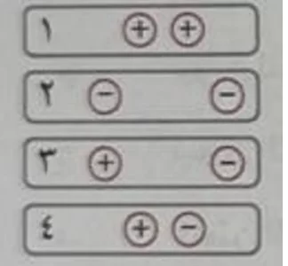 في الشكل المجاور كرتين مشحونتين، حيث شحنة الكرة الموجبة ضعف شحنة الكرة السالبة، أي من هذه الحالات الأربعة تكون القوة الكهربائية بين هاتين الشحنتين هي الأقل؟