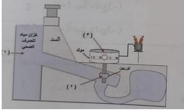 في السد، يمتلك الماء المحتجز طاقة وضع (1)، وعند تدفقه تتحول لطاقة حركية (2) لتدوير التوربينات، ثم تتحول في المولد إلى طاقة كهربائية (3).
