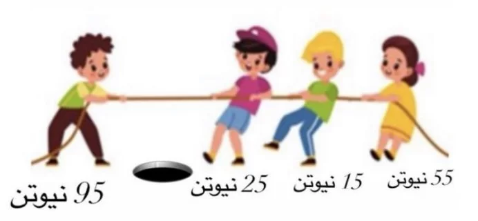 مجموع القوى جهة اليمين هو \( 55 + 15 + 25 = 95 \) نيوتن، والقوة جهة اليسار هي 95 نيوتن. بما أن القوى متساوية ومتعاكسة، فإن المحصلة تساوي صفراً، ولن يتحرك أحد.