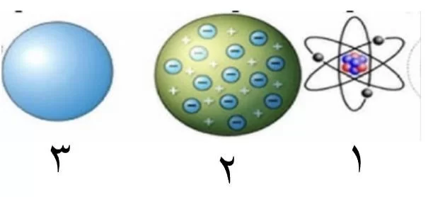 التسلسل يبدأ بنموذج دالتون (الكرة المصمتة 3)، ثم نموذج طومسون (2)، وصولاً إلى النموذج السحابي الحديث (1).