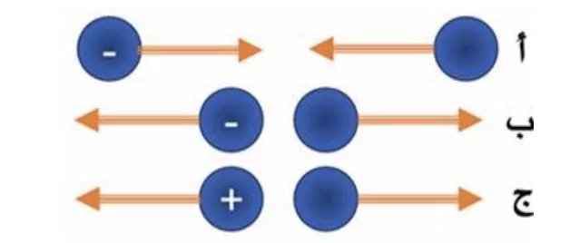 يحدث التنافر في الحالتين (أ) و(ب) نتيجة وجود شحنات متشابهة، بينما يحدث التجاذب في الحالة (ج) نتيجة وجود شحنات مختلفة.