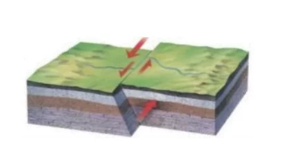 يوضح الشكل حركة كتل الصخور أفقياً بجانب بعضها البعض دون حركة عمودية، وهذا هو الصدع الانزلاقي الجانبي.