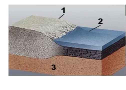 الرقم 1 يشير للقشرة القارية، بينما الرقم 2 يشير للقشرة الأرضية الموجودة تحت قاع المحيطات وتعرف بالقشرة المحيطية.