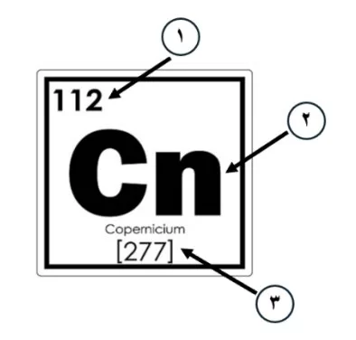 في تمثيل العناصر: الرقم العلوي (1) هو العدد الذري، والحروف (2) هي الرمز الكيميائي للعنصر، والرقم السفلي (3) هو الكتلة الذرية.