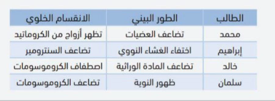 طلب معلم العلوم من أربعة طلاب كتابة أهم التغيرات التي تحدث أثناء دورة الخلية في أطوارها المختلفة، فكانت إجاباتهم كما في الجدول أدناه. الطالبان اللذان أجابا على السؤال بشكل صحيح هما: