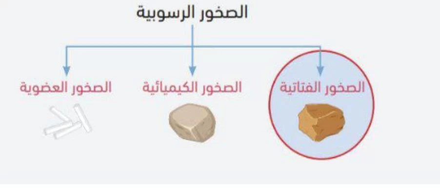 الدائرة تحدد 'الصخور الفتاتية'، والحجر الرملي هو مثال كلاسيكي للصخور الرسوبية الفتاتية التي تتكون من ترسب حبيبات الرمل.
