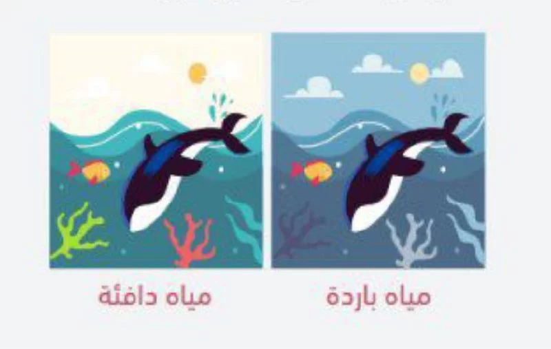 بالنظر إلى الصورتين أدناه، أي مما يلي يحدث للحوت والسمكة عند تغير درجة الحرارة في البيئة المحيطة ؟
