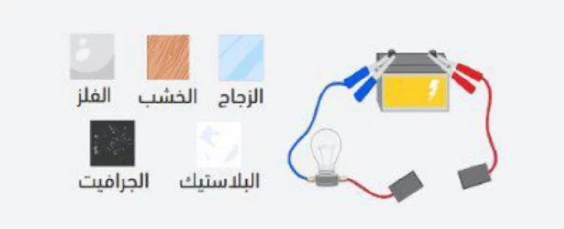 المواد الموصلة هي التي تسمح بمرور التيار الكهربائي وإضاءة المصباح؛ الفلزات والجرافيت (أحد أشكال الكربون) هما الموصلان في القائمة الموضحة.