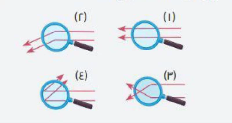 أي الرسوم التوضيحية التالية تُظهر ما سيحدث لمسار الضوء عند مروره بعدسة مكبرة؟